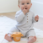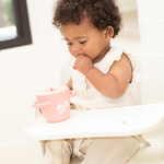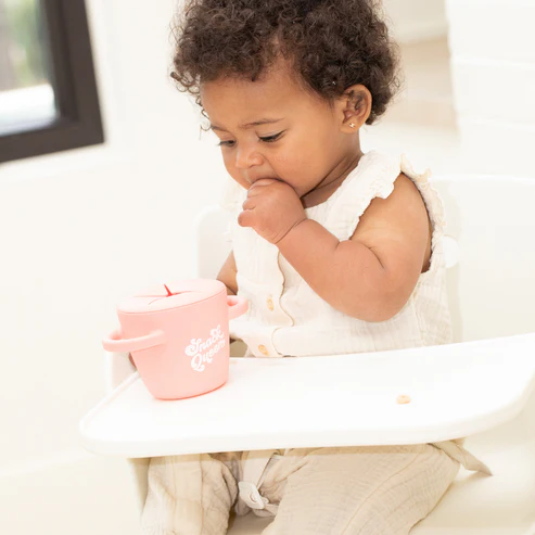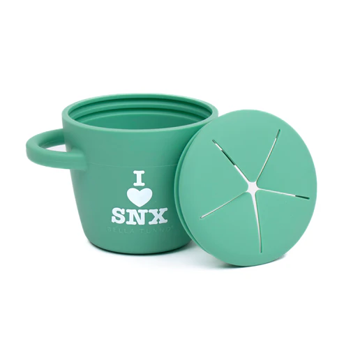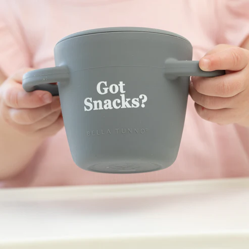 The Happy Snacker is a first-of-its-kind two-piece silicone snack cup with a mess-proof snap-tight lid and soft silicone opening so little hands can easily access food and prevent spills. Designed with easy-grip handles, it fits in car seats and stroller cup holders.