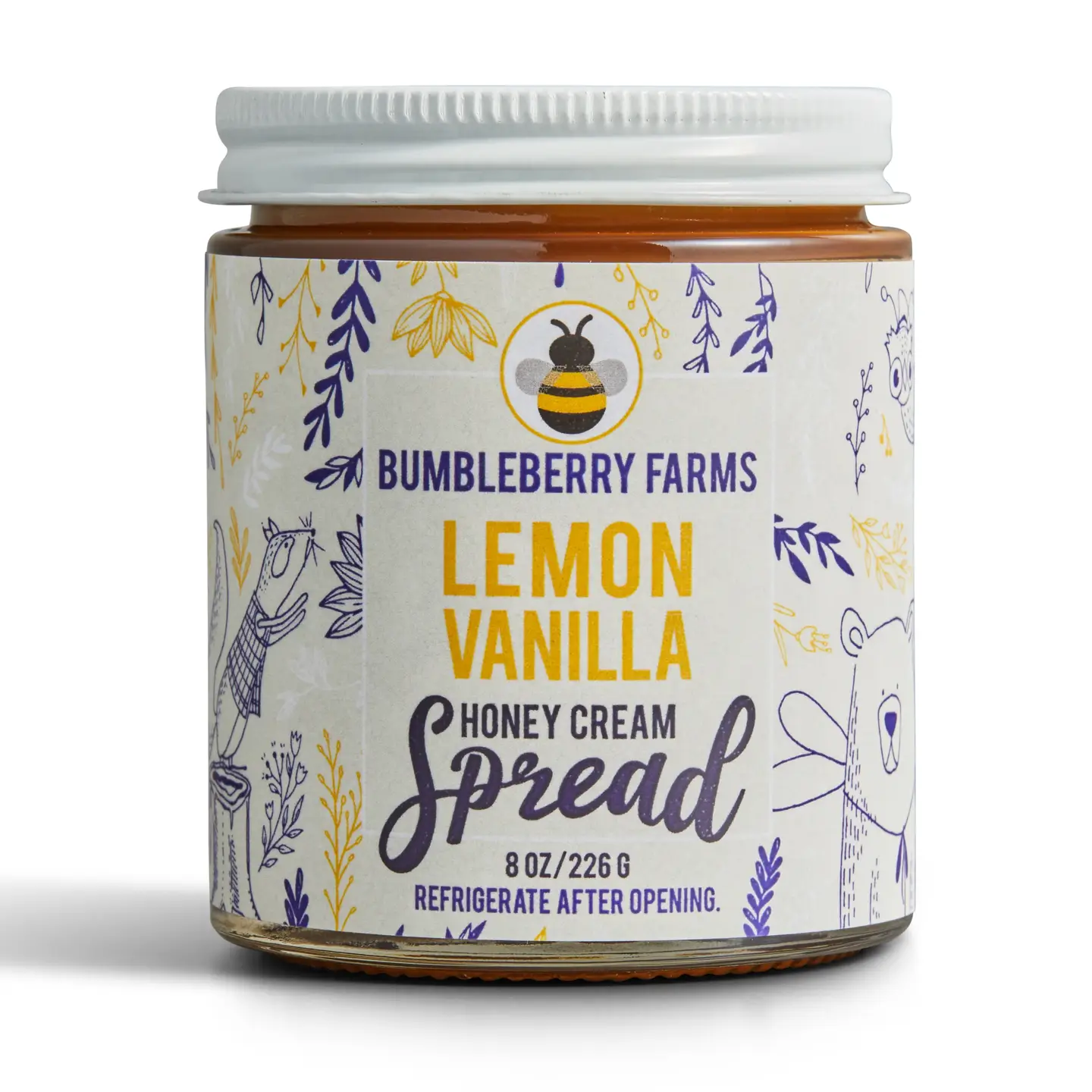 Fans have been asking us for years to create a lemon version of our popular spreads...well, here it is: Lemon Vanilla Honey Cream Spread! Our sweet spread has a slightly tart lemony bite followed by smooth, vanilla and caramel flavors. No preservatives used. Refrigerate after opening. Yummy on a scone, loaf bread, English muffin, blueberry crepes, ricotta pancakes....or a spoon! In our test kitchen, we crafted a luscious dessert pizza with a baked crust slathered with Lemon Vanilla Honey Cream Spread, a layer of mascarpone cheese (ricotta works, too), sliced pears, fresh mint, and a drizzle of Bumbleberry Farms pure clover honey. A thousand times YUM! Refrigerate after opening.