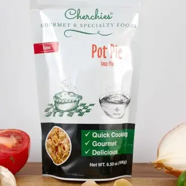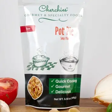 Pot Pie - Cherchies Pot Pie Soup has a new look! With rich homemade flavor, orecchiette pasta, vegetables, and tasty seasoning, it's quick and delicious comfort food. Add your favorite meat for a satisfying meal in just 35 minutes. Makes 6 servings