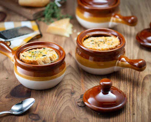 These sturdy ceramic crocks boast a generously-sized handle that stays cool for an effortless transition from oven to table. They're ideal for serving up a variety of dishes, including our top pick: mouthwatering, gooey French Onion with melted cheese on top.