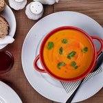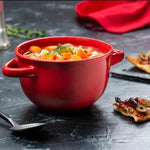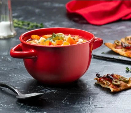 These sturdy ceramic crocks boast a generously-sized handle that stays cool for an effortless transition from oven to table. The red ceramic finish will look beautiful in any kitchen. They're ideal for serving up a variety of dishes, including our top pick: mouthwatering, gooey French Onion with melted cheese on top.