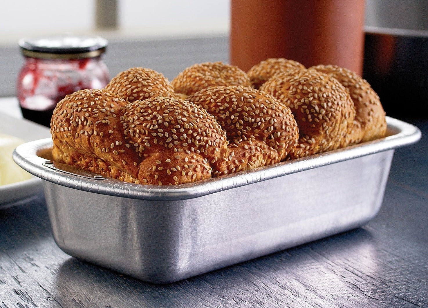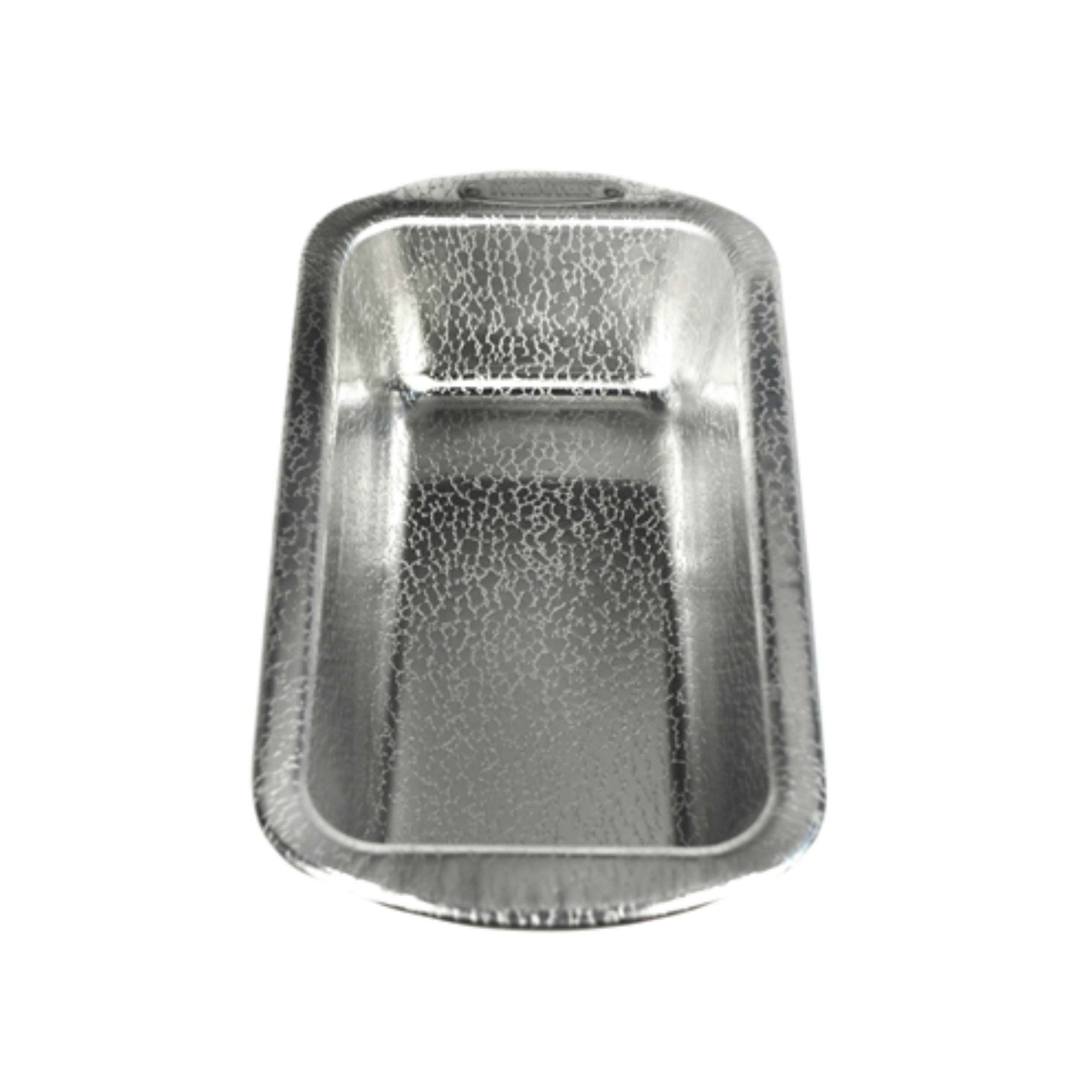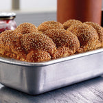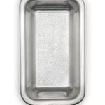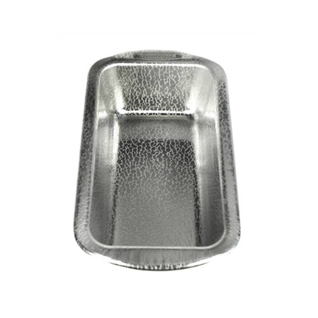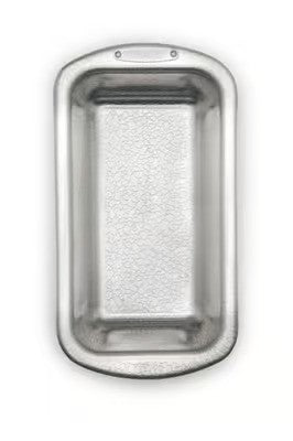 Doughmakers pans are made with a heavy gauge, recyclable aluminum. The patent, pebble pattern allows easy release. This loaf pan is 8.5" x 4.5"