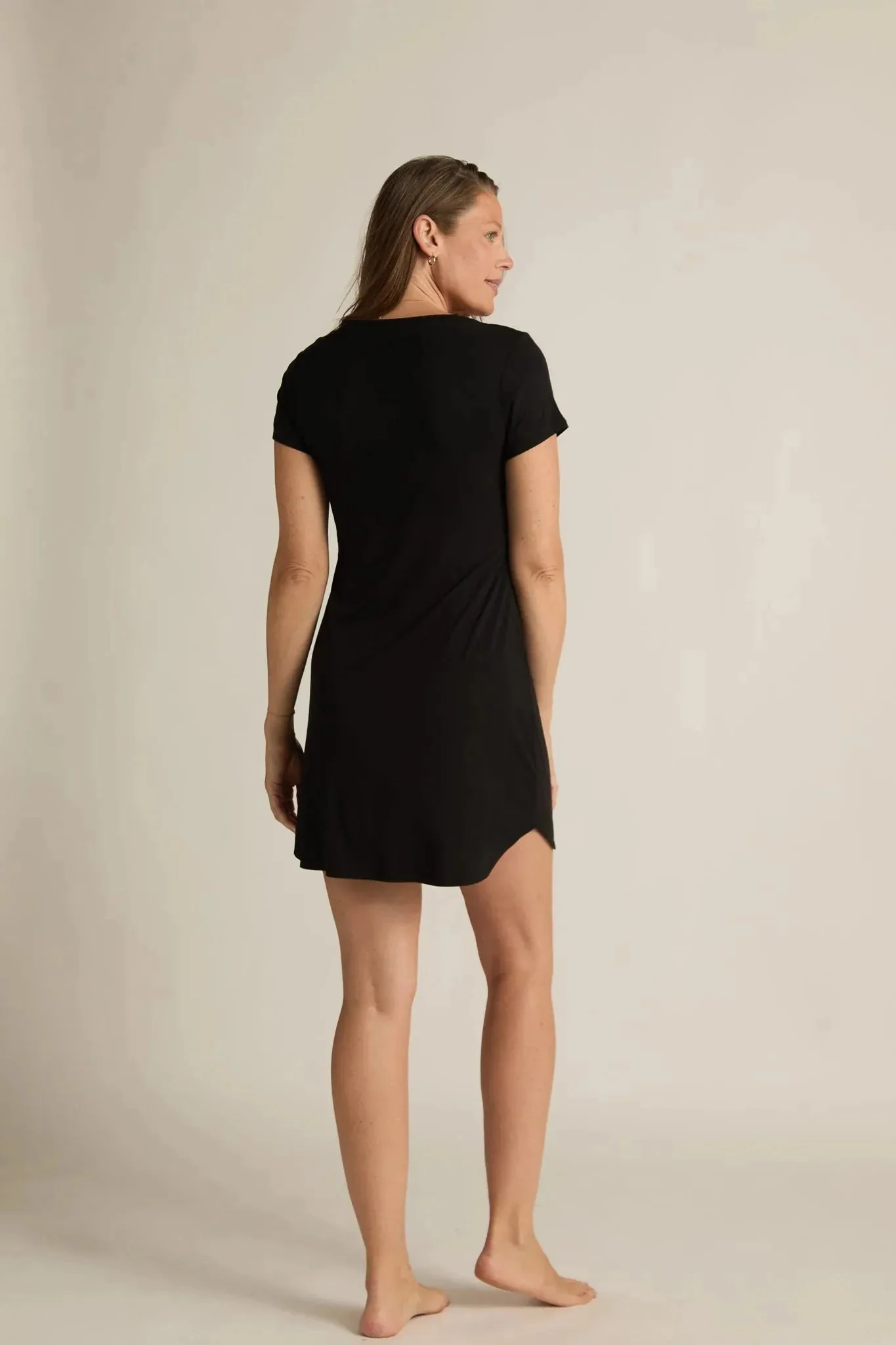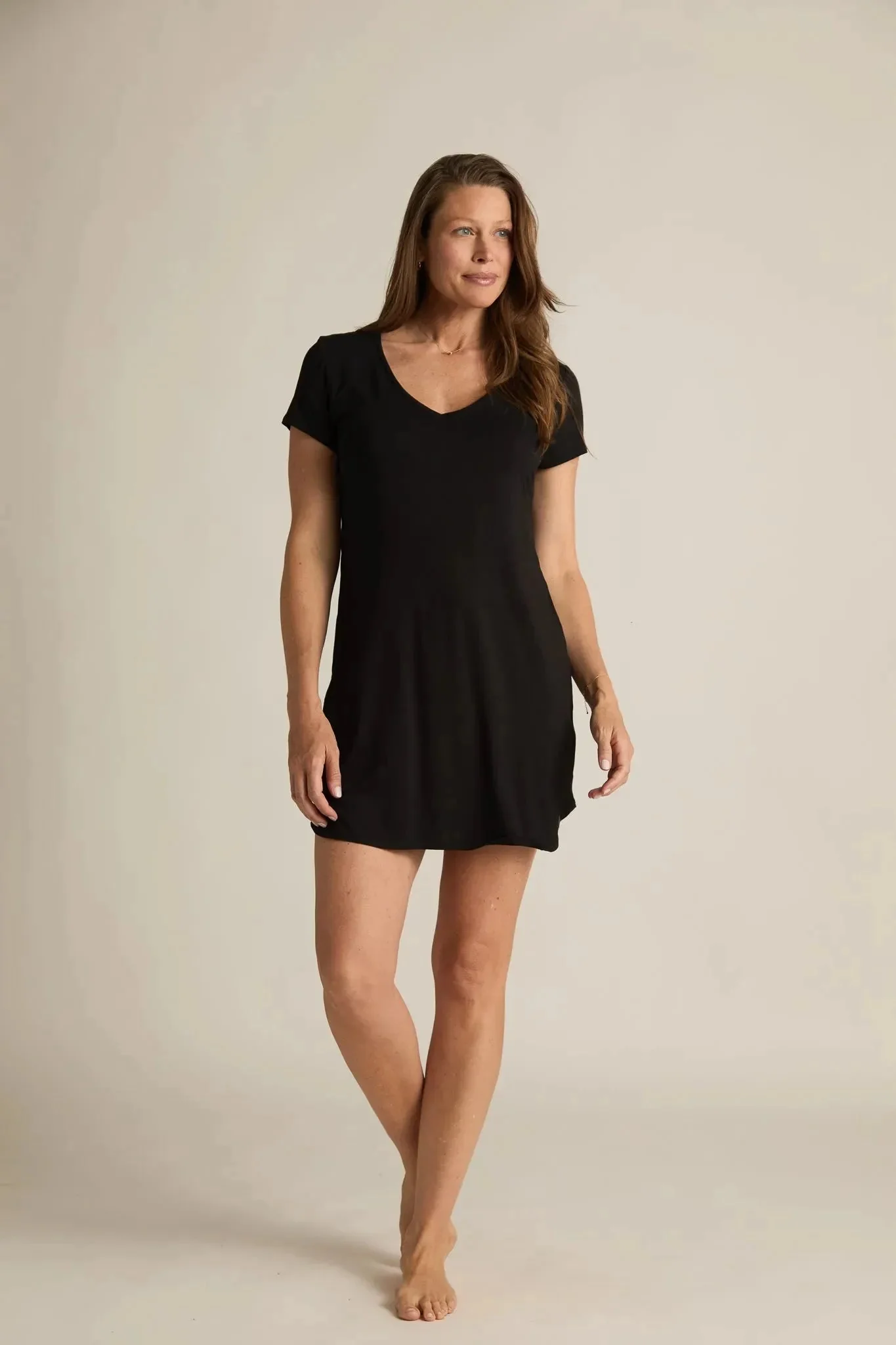 Simplicity redefined. A shallow v-neck nightgown with high-low curved hemline is loose fit through the bodice for added ease. Our exclusive discretion liner in the upper body adds subtle privacy.