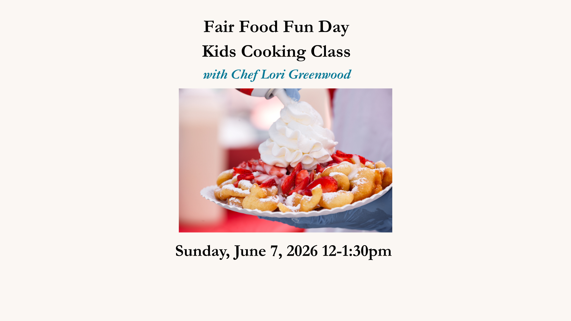 Fair Food Fun Day Kids Cooking Class –June 7, 2026 12-1:30pm Chef Lori Greenwood