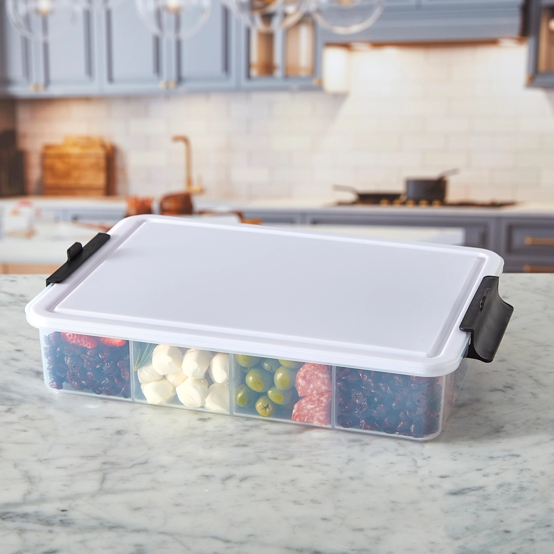 ON-THE-GO CONVENIENCE: "Make it. Take it. Enjoy it." wherever you are, ideal for picnics, vacations, road trips, sports events, or snacking at home. Offers a practical solution for enjoying your favorite treats. SECURE LOCKING HANDLES: Equipped with black handles that securely lock bamboo the lid into place, ensuring your snacks stay safe and sealed during transport. DUAL-FUNCTION LID: Poly lid also serves as a cutting board. Ideal for on the go. This reversible cutting board lid is perfect for everyday food preparation, from slicing fruit to chopping veggies ORGANIZED STORAGE: Designed with 11 compartments, this snacklebox provides ample space to neatly organize a variety of snacks, making them easily accessible. PATENT PENDING DESIGN: Elevate your hosting experience with the FARBERWARE Build-a-Board – a refined 11x16 Inch essential.