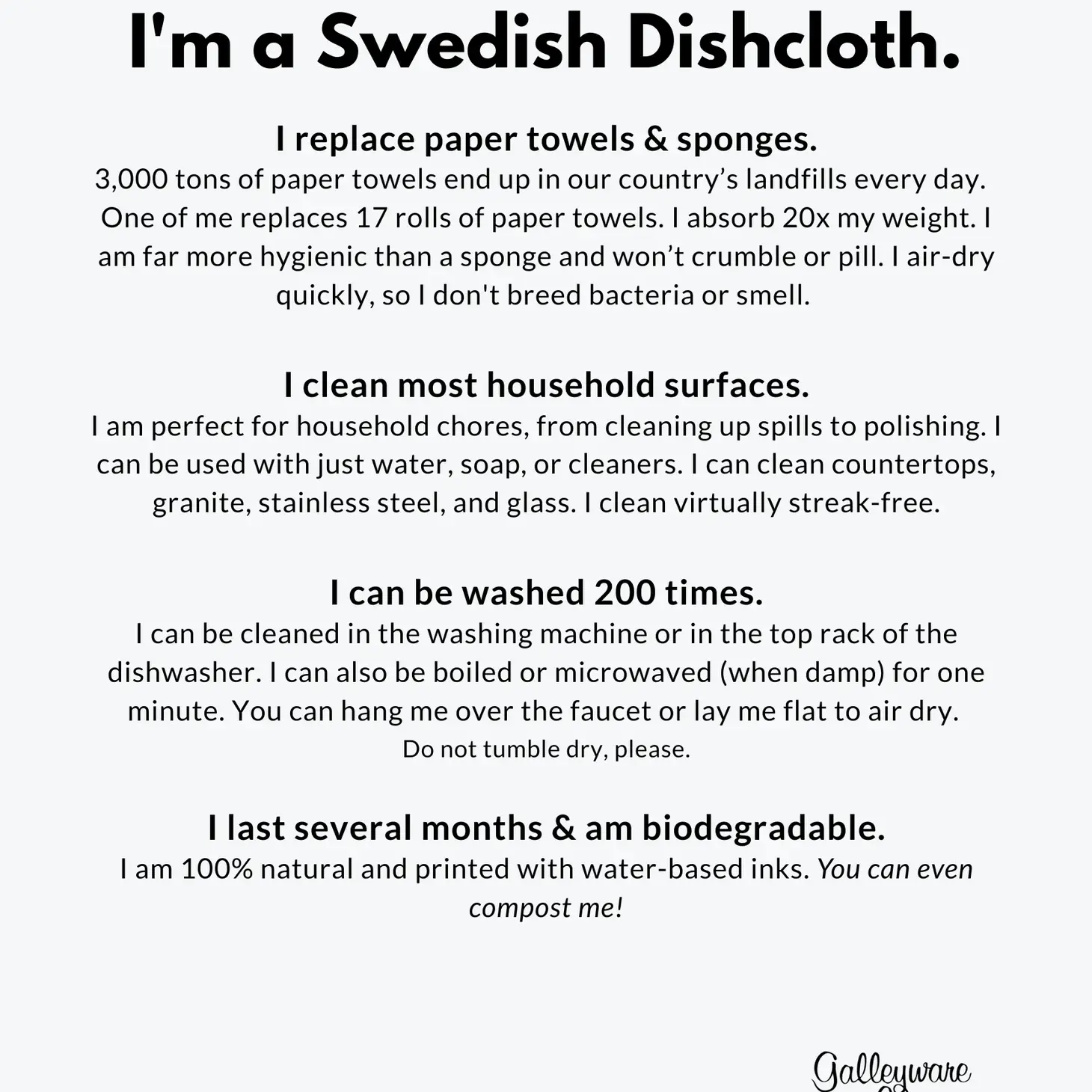 Eco-conscious and playful, these USA-made Swedish dishcloths made of all-natural, biodegradable materials are an eco-friendly solution for a sparkling clean kitchen. Ditch sponges and paper towels and toss these sustainable cloths in the washing machine after use. And when they're all used up, just toss them in the compost, how easy is that? Made in the USA!