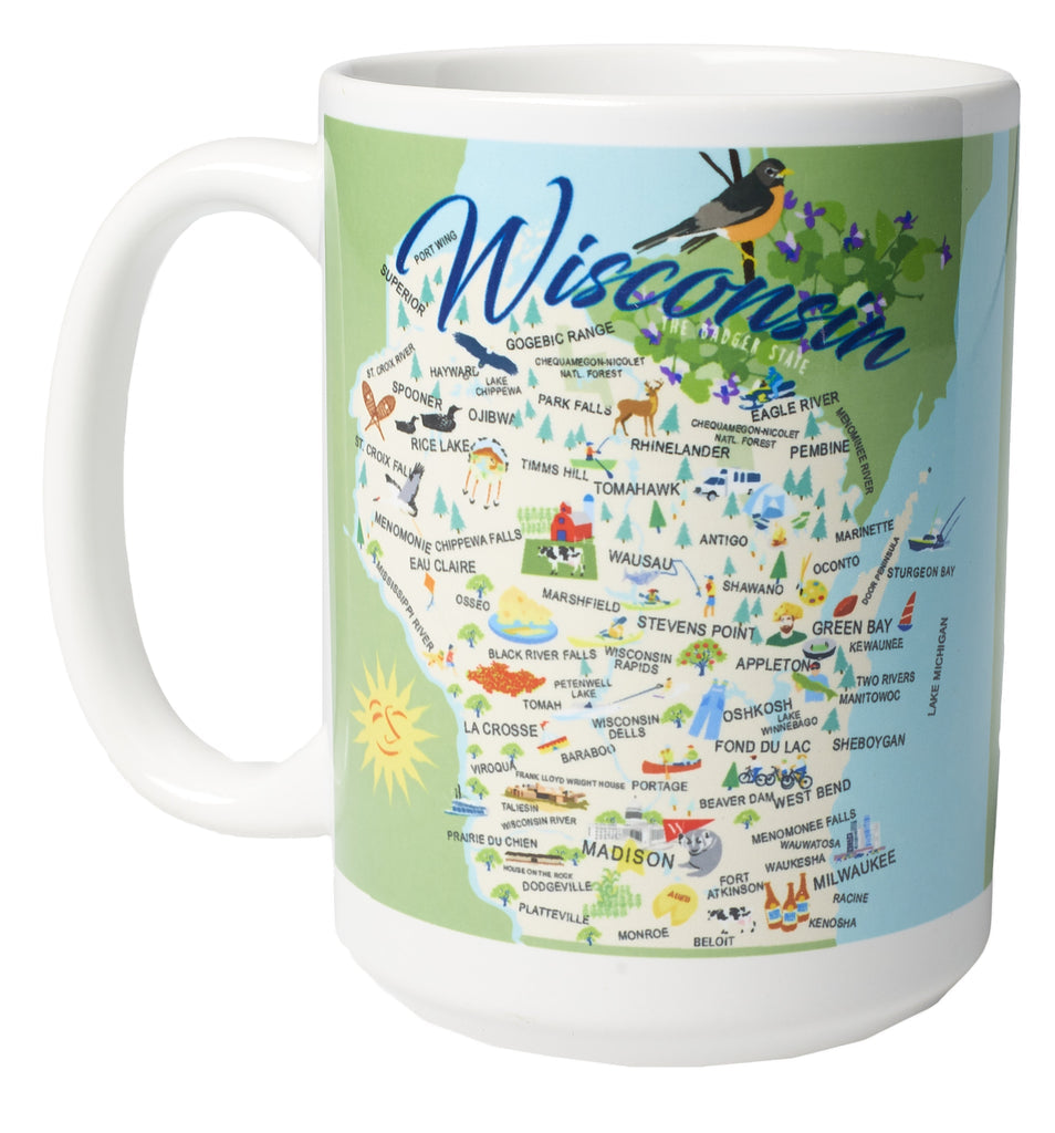 The Galleyware mug features a playful depiction of Wisconsin's top destinations and landmarks on a colorful 15 oz. ceramic mug. Makes the perfect gift for any Wisconsin lover!