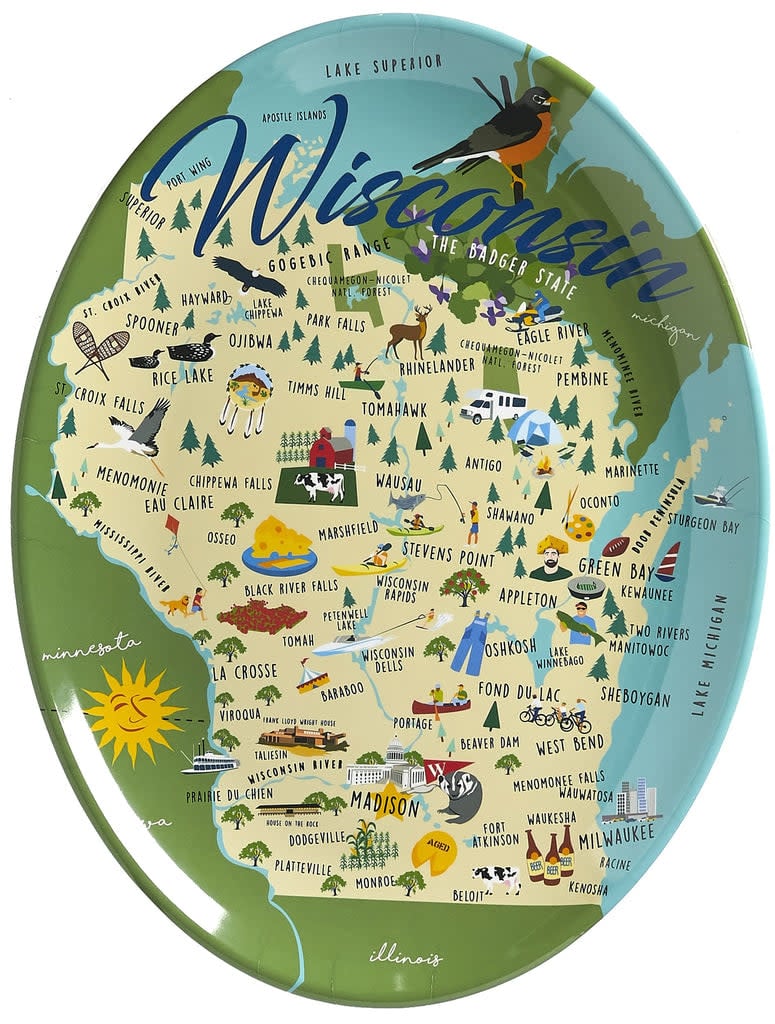 Behold, the 16-inch Wisconsin melamine platter from Galleyware, adorned with charming scenes Wisconsin towns and sightseeing spots. Makes the perfect gift for anyone who loves Wisconsin!