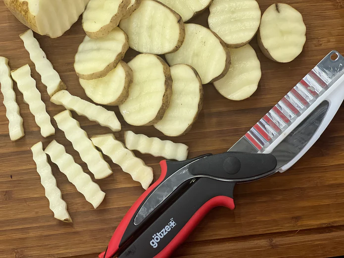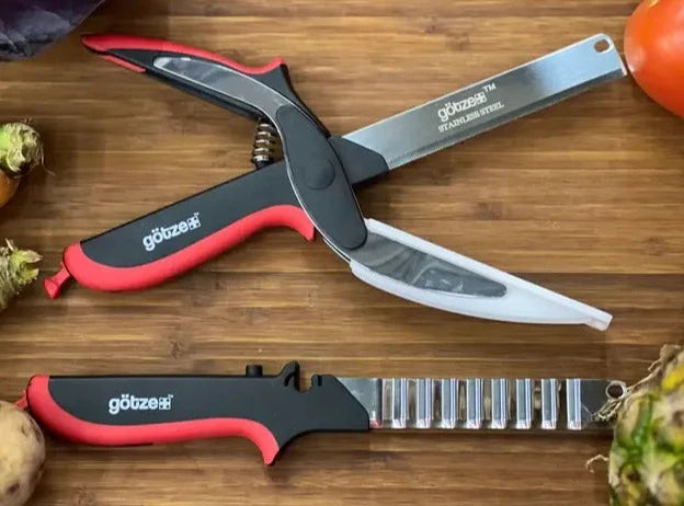 Get ready for the ultimate kitchen cutting experience with Gotze Shears! These innovative shears combine a knife and cutting board in one, making slicing through vegetables and fruits a breeze. Thanks to cutting-edge laser technology, these shears guarantee a consistently sharp knife edge, making quick work of cucumbers, tomatoes, and even pineapples. Look no further, these shears have got you covered.