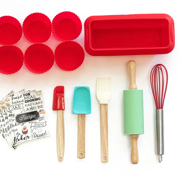 Start young chefs on the path to real baking fun with Handstand Kitchen’s Jr Baker's Set! This 17 piece starter baking set has the essential bakeware, utensils and recipes for chefs of all ages to learn to bake cupcakes, muffins, cookies, cakes and more! Includes: 1 silicone loaf pan, 1 silicone whisk, 1 silicone rolling pin, 1 silicone spatula, 1 silicone pastry brush, 1 silicone mixing spoon, 6 silicone cupcake liners and 5 recipe cards.