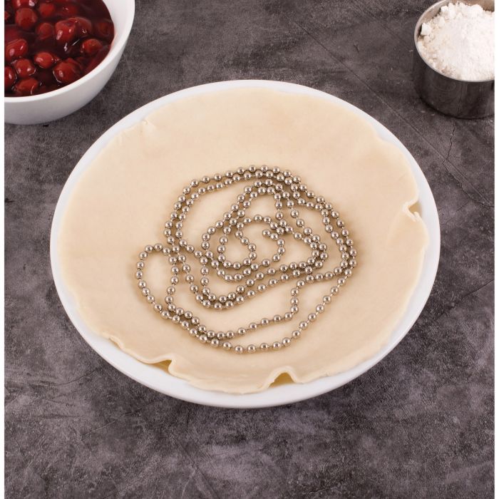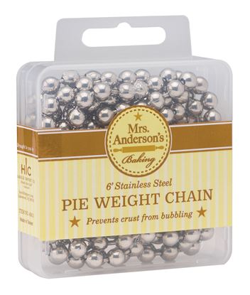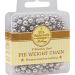 Take the hassle out of blind baking empty pie shells with Mrs. Anderson's durable, reusable Pie Weight Chain. Its flexible beaded design allows for effortless placement and removal, ensuring a perfectly even and bubble-free crust. Perfect for a variety of pie sizes, it comes with a handy storage container and makes blind baking a breeze for all your favorite desserts.