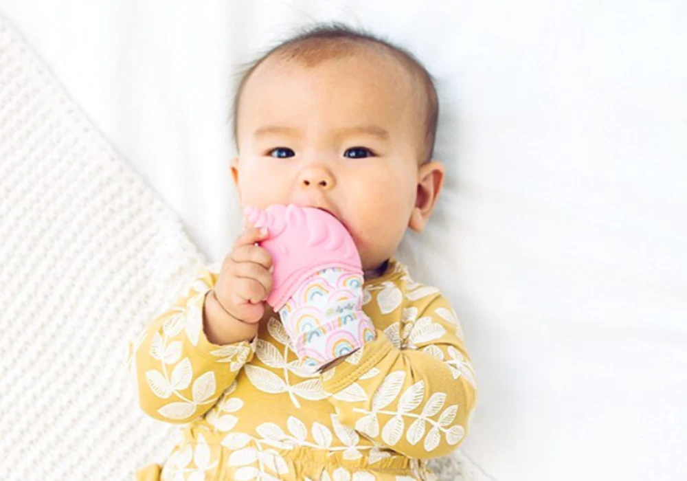 Babies love to chew to soothe swollen and teething gums. Itzy Ritzy's modern teething mitt is worn like a glove, making it perfect for babies who can't yet hold a teether. The Itzy Ritzy® Silicone Teething Mitt is made from food grade silicone and is durable, flexible and non-toxic. It includes a stimulating crinkle sound to keep baby entertained. The textured silicone surface helps baby discover new senses while getting relief from sore gums.