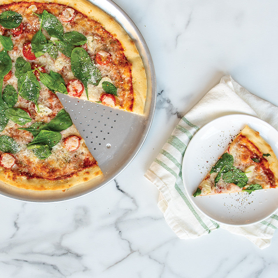 Experience the magic of natural aluminum construction! Heat evenly and quickly, achieve golden and crispy crusts, and create the perfect pizza every time. The center's perforations provide optimal airflow, keeping your toppings piled high and your crusts perfectly crisp. This pan is the pinnacle of pizza perfection. And the cherry on top? It's made with pride in the USA!