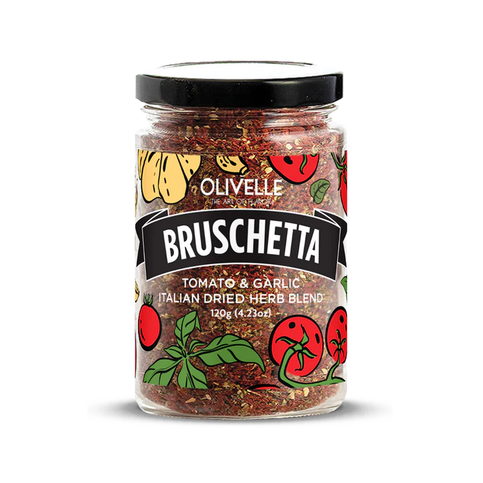 Bruschetta: Spice up any dish with Olivelle's Bruschetta Dried Herb Blend! Just add hot water and olive oil for a delicious burst of tomato and garlic flavor! Ingredients: Tomato, Herbs & Spices (Garlic, Basil, Oregano, Sweet Bell Pepper), Salt