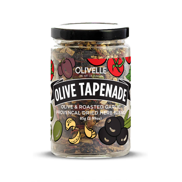 Olive Tapenade: Enjoy the tasty blend of olive, tomato, and garlic with bruschetta for a flavorful touch. Perfect for Mediterranean-inspired dishes with a hint of umami. Ingredients: Dried Olives (Green and Black), Tomato Bruschetta (Tomato, Herbs & Spices, Salt), Fire Roasted Garlic, Basil.