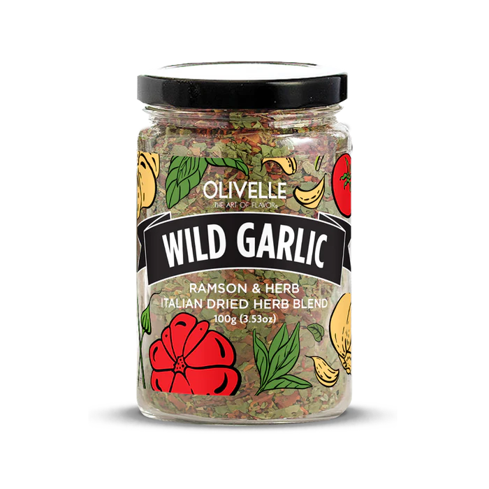 Wild Garlic: Mild and flavorful garlic intertwined with bursts of juicy tomato! Olivelle's Wild Garlic Dried Herb Blend features ramson (wild garlic leaf) for a subtler garlic taste. This unique blend is perfect for enhancing all sorts of dishes, from dips to eggs. Ingredients: Dried Olives (Green and Black), Tomato Bruschetta (Tomato, Herbs & Spices, Salt), Fire Roasted Garlic, Basil