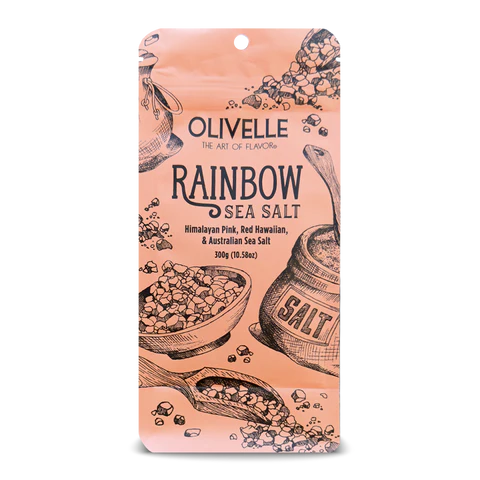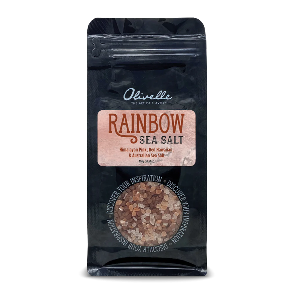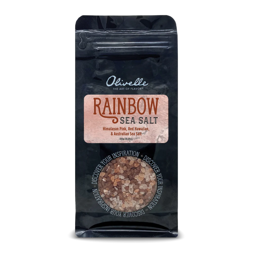 Rainbow Sea Salt: Made up of Himalayan Sea Salt, Red Hawaiian, and Australian White salts. Olivelle combined these three salts to come up with well-balanced flavor. Tastes great on everything!