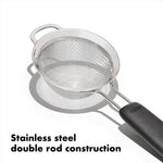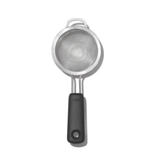 The OXO Good Grips 3 in Mini Strainer is great for sprinkling powdered sugar on desserts, brewing loose leaf tea, straining out citrus juice,, and other tasks. Its broad rim and stabilizing loop keep it steady during use, and its sturdy double-rod build ensures long-lasting durability. The non-slip grip offers a secure hold, even when wet. Plus, the small loop on one end allows for convenient one-handed use by balancing on cups.