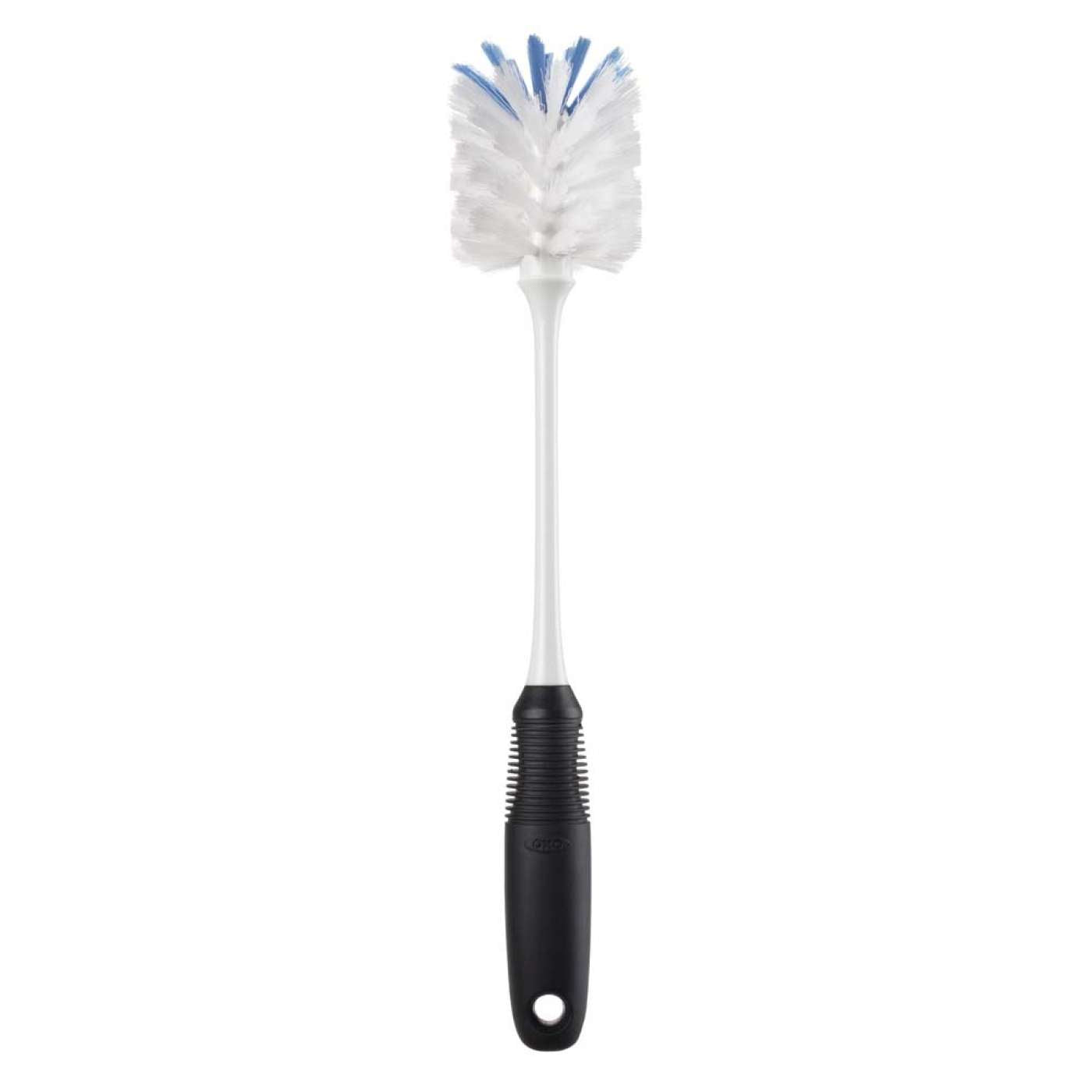 The OXO Good Grips Bottle Brush features a bristle head designed for gentle cleaning and serious scrubbing. The long, durable neck easily reaches inside bottles, pitchers and carafes. The Oxo Bottle Brush has a soft, non-slip grip, even when wet. It is safe for stemware, baby bottles and other delicate containers.