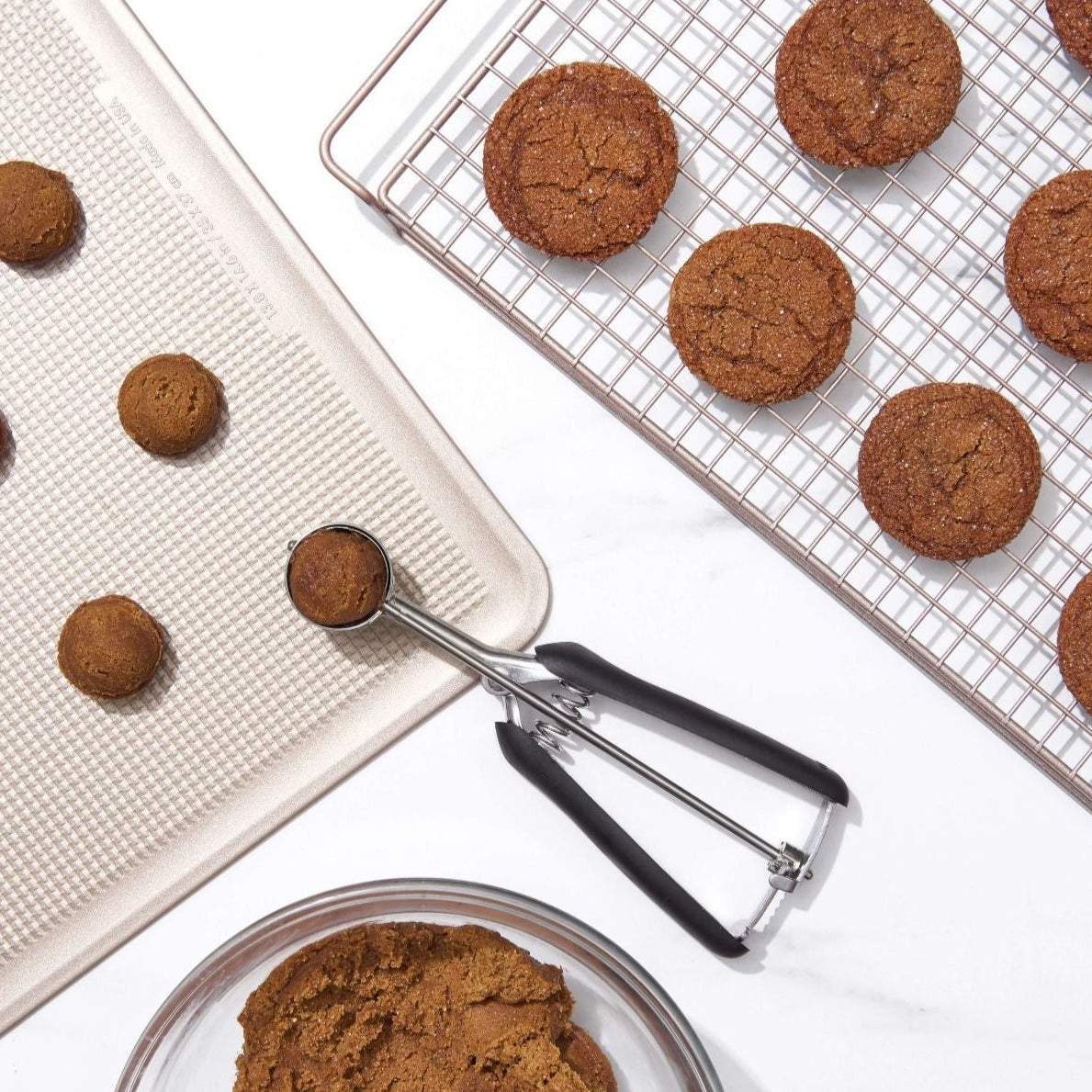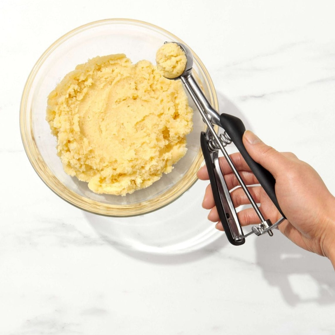 For easy scooping and consistently round cookies, try the OXO Good Grips Cookie Scoops. The Oxo Small Cookie Scoop has a soft grip that absorbs pressure while you squeeze to easily release your cookie dough. The wiper cleanly ejects even sticky dough.