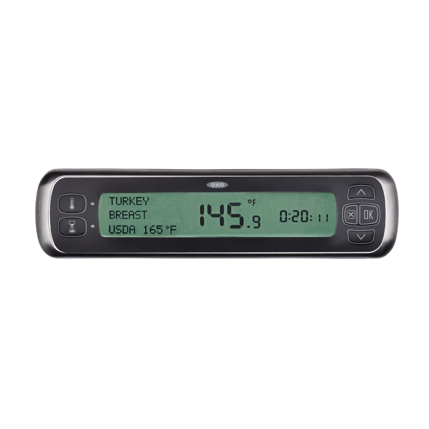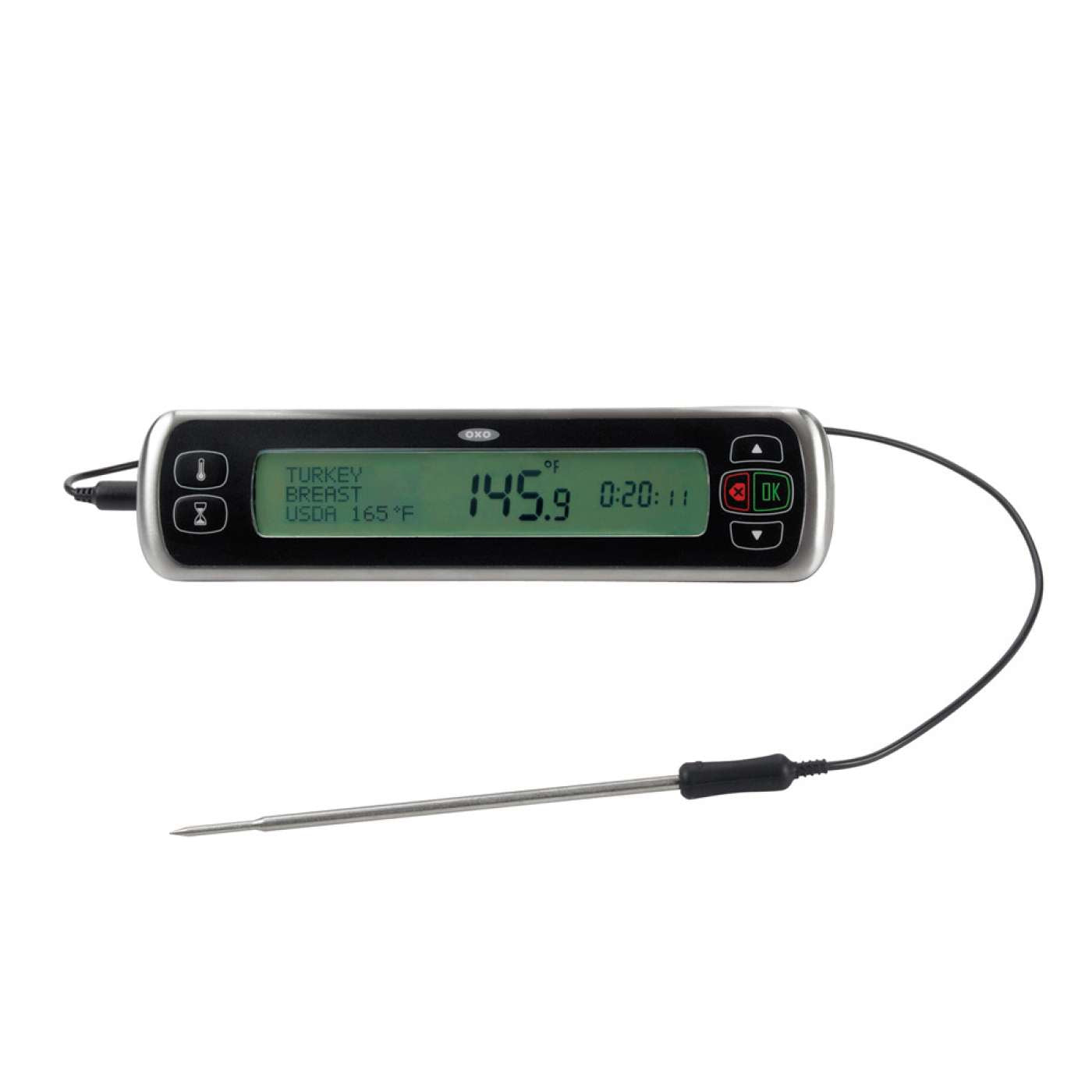 Say goodbye to guessing while cooking meat! The OXO Good Grips Chef’s Precision Digital Leave-In Meat Thermometer comes with chef and USDA-recommended temperatures, or you can use the 24-hour timer for low and slow cooking. Just insert the probe into your meat, thread the stainless steel cord through the oven door or grill, and let the easy-to-read display and continuous temperature monitoring do the rest until the 10 degree warning signals it's ready. No more overcooked meat - trust this thermometer to help you cook to perfection!