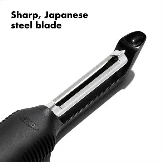 The Oxo Good Grips Swivel Peeler effortlessly peels tough-skinned produce with this durable, rustproof tool. It features two sharp Japanese swiveling blades and an easy-grip handle, it's perfect for fast, repetitive tasks like preparing apples and cucumbers. Plus, it even has a built-in potato eyer and a hanging hole for convenient storage