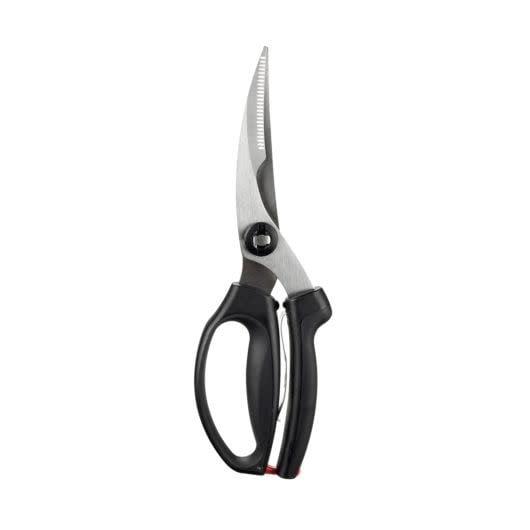 Slice and snip through poultry with ease using these Oxo Poultry Shears. Crafted with reliable stainless steel blades that are smartly curved and tapered for precise cutting. The blade notch ensures a secure grip on bones, while the loop handle and bolster prevent any slipping. And when it's time to clean up, the handle lock keeps the blades safely closed and easily disassembles for speedy maintenance.