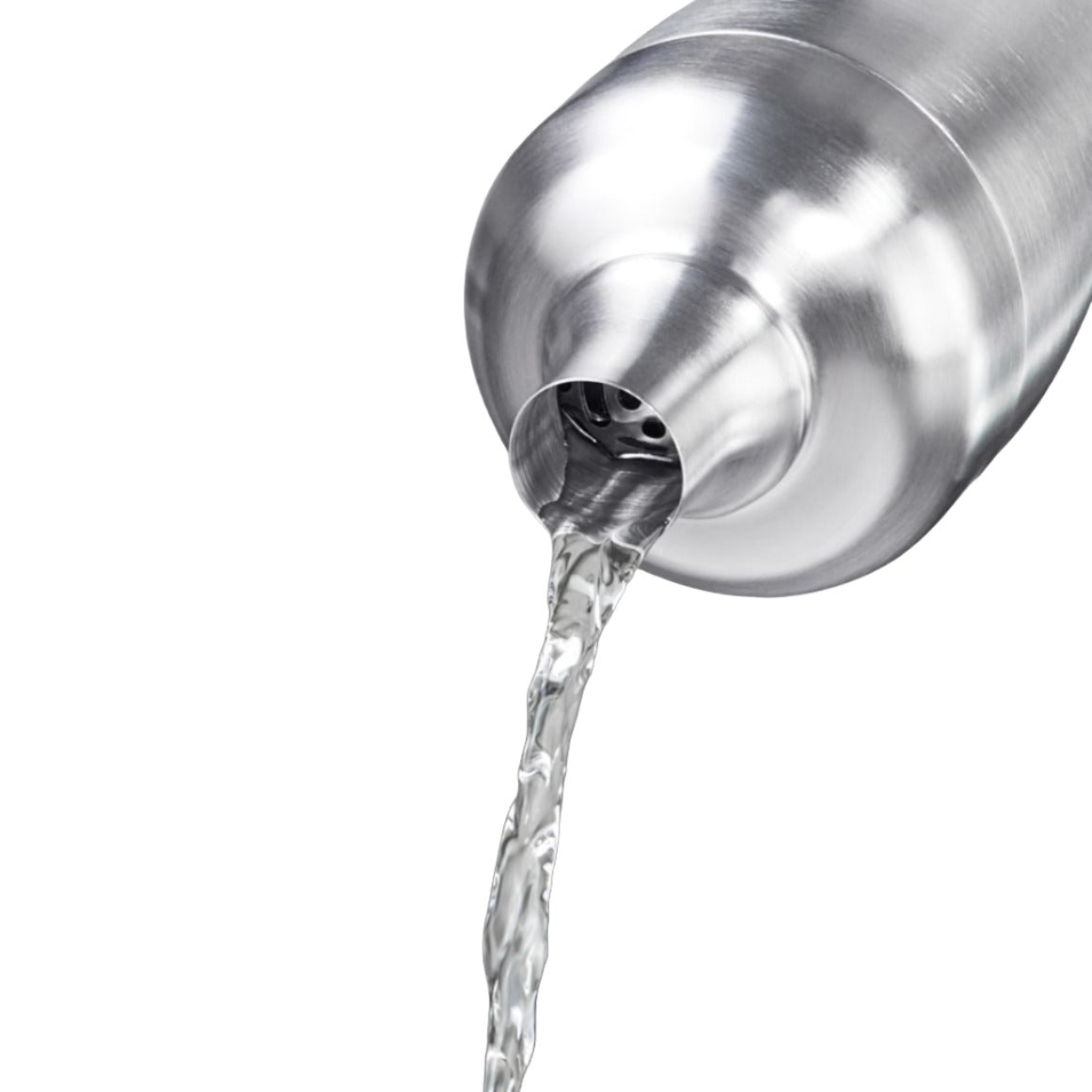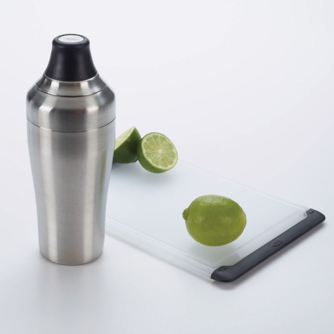 Mix and pour any cocktail in style with the OXO Steel Cocktail Shaker. The 16-ounce Shaker has a built-in strainer and double wall stainless steel design for easy use. With a soft grip surface and measurement markings, making the perfect drink is a breeze. Set includes a jigger cap with markings of 1-oz, 3/4-oz and 1/2-oz.