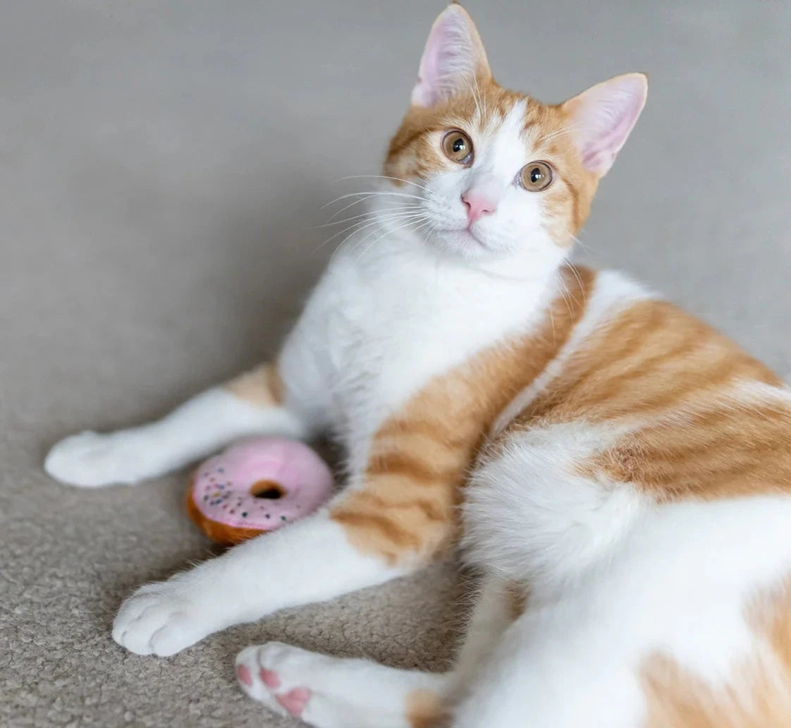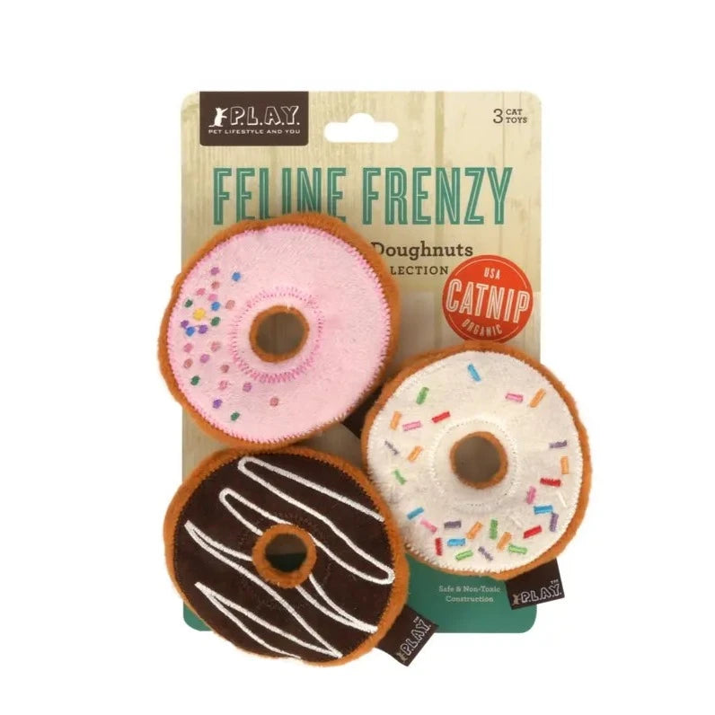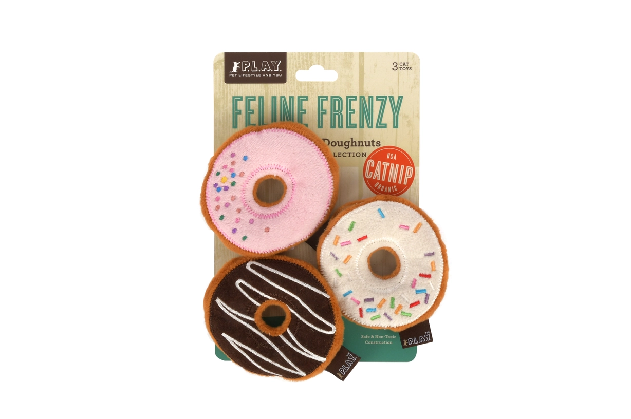 PLAY's Kitty Kreme Doughnuts are stuffed with certified organic catnip from Mountain Rose Herbs grown in Washington State. They use eco-friendly PlanetFill® filler made from recycled plastic bottles. These toys come packed with amusing crinkles and are double-stitched for extra durability.