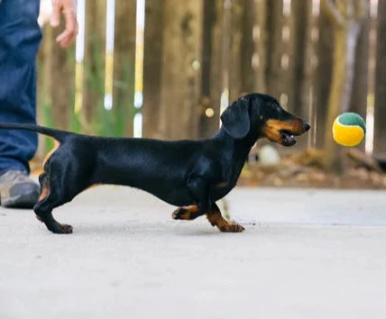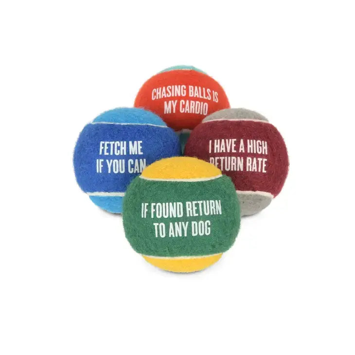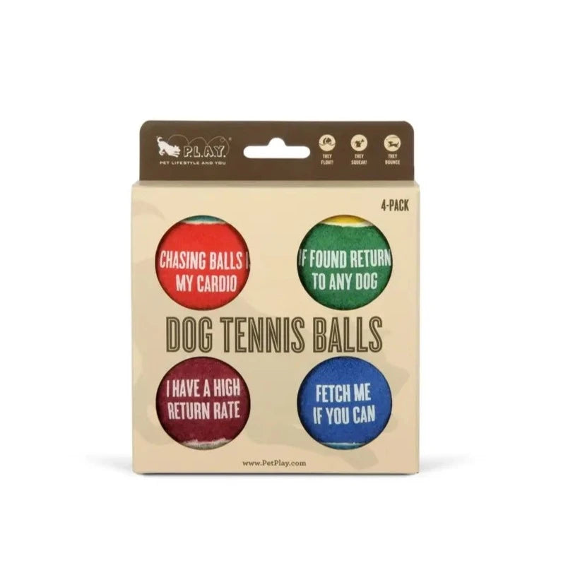 The PLAY Dog Tennis Ball 4 pack comes with its own set of clever catchphrases on each ball! These balls are not only bouncy and floatable, but they also have squeakers for added fun and to keep your pup engaged. They're ideal for dogs who are gentle chewers.