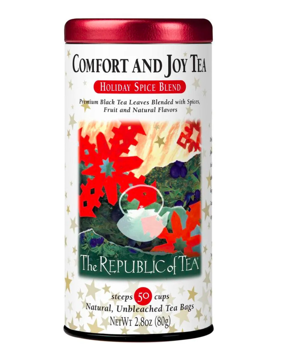 Cinnamon and cloves are the warm shining stars of this tea blend. Wrap your hands around a cup that will surely put you in the mood for celebration. Premium black tea leaves create a substantial base for this spicy infusion, while apples and just a hint of licorice sweeten each sip. Comfort and Joy features the best flavors of the holidays: cinnamon, cloves, apples, and licorice root blended with fine black tea.