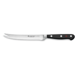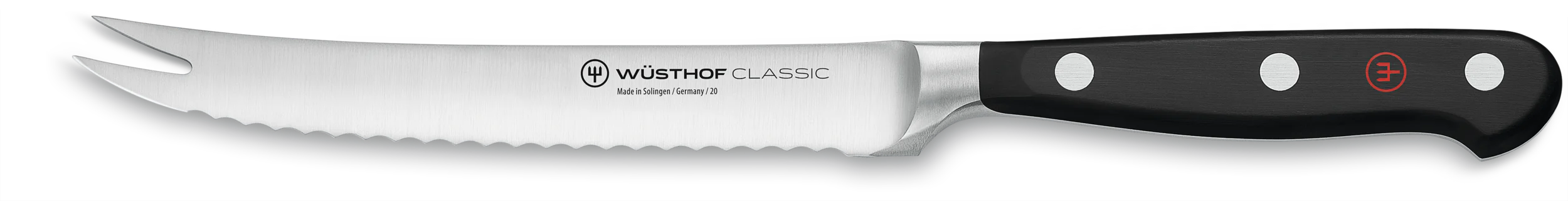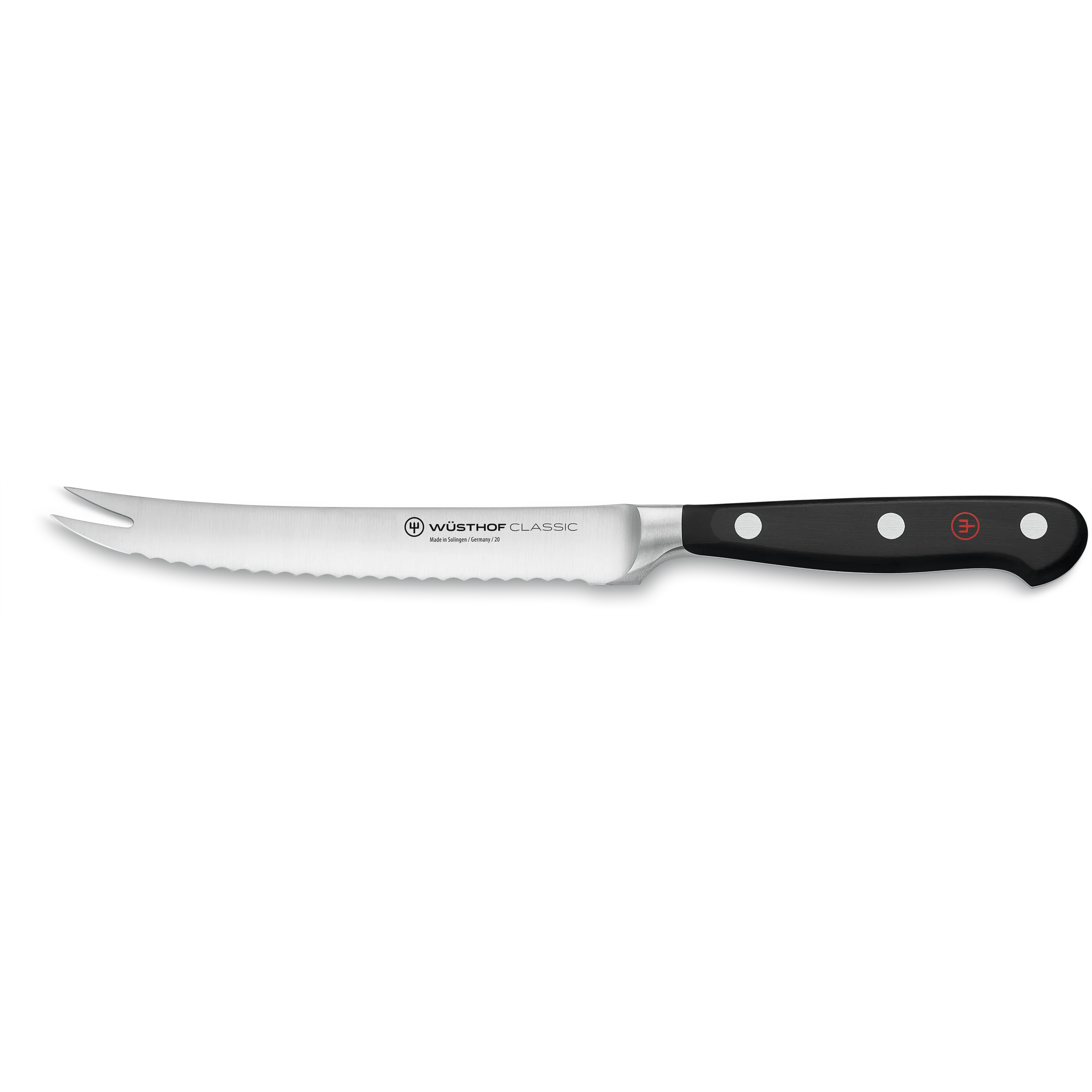 The knife with a forked tip for tomatoes, cheese and fruit: the finely serrated edge cuts smoothly through firm top layers such as rinds, crusts or skin and is also suitable for cheese or many kinds of fruit. The forked tip is designed to pick up the small slices of the ingredients. 5.5in Blade. Made in Germany.