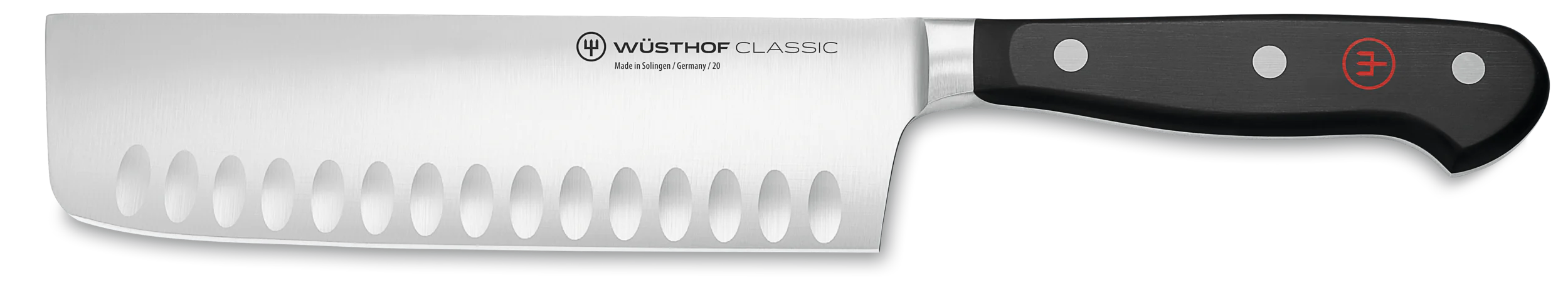 The Japanese vegetable knife: extremely versatile and suitable for tasks such as cutting, dicing or chopping. Its shape is reminiscent of a cleaver but should not be confused with it as a Nakiri is not suitable for rough tasks (such as splitting bones). The very sharp and finely ground blade is more designed to prep vegetables, herbs and fruit very quickly and finely. The dimpled edge of the knife (slight depressions in the blade that allow small pockets of air to form) prevents ingredients from sticking. 7in. Blade. Made in Germany.